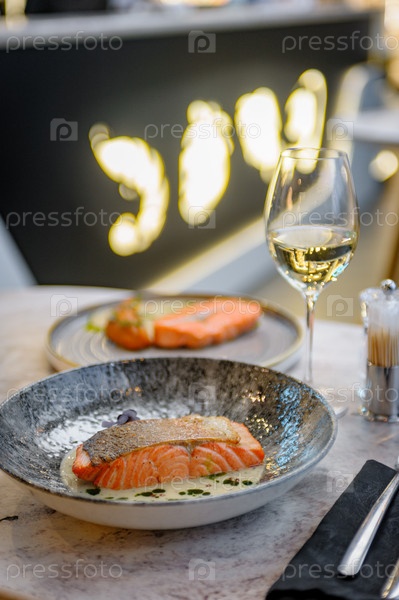 Филе лосося в сливочном соусе с зеленью на мраморном столе в ресторане