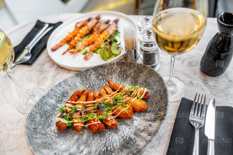 Королевские креветки в плаще панко с соусом на серой тарелке