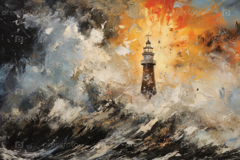 Старый маяк на скалистом берегу во время сильного шторма, иллюстрация в стиле масляной живописи