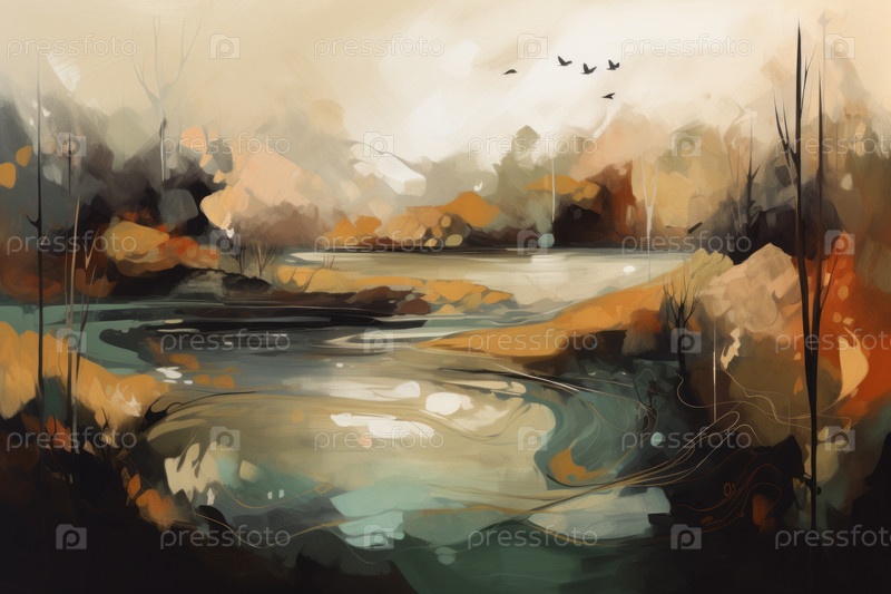Лесной пруд во время осеннего листопада, иллюстрация в стиле масляной живописи