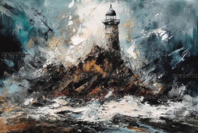 Старый маяк на скалистом берегу во время сильного шторма, иллюстрация в стиле масляной живописи