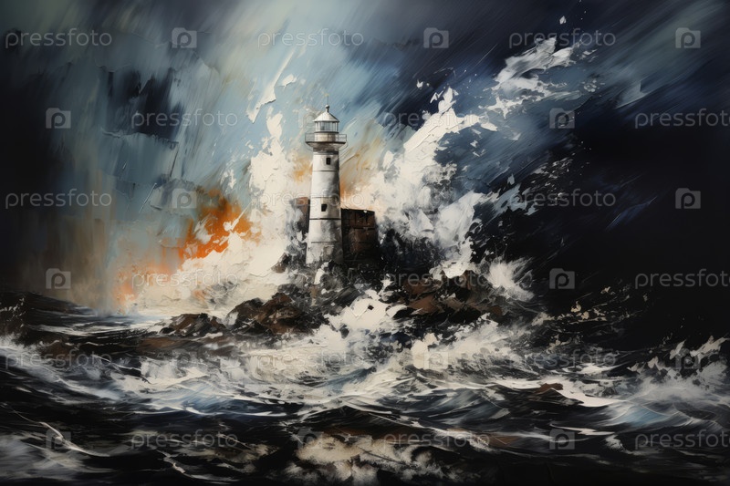 Старый маяк на скалистом берегу во время сильного шторма, иллюстрация в стиле масляной живописи