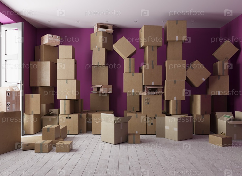 Комната с огромным количеством коробок. Концепция посылки. Концепция переезда в новый дом. 3D-концепция