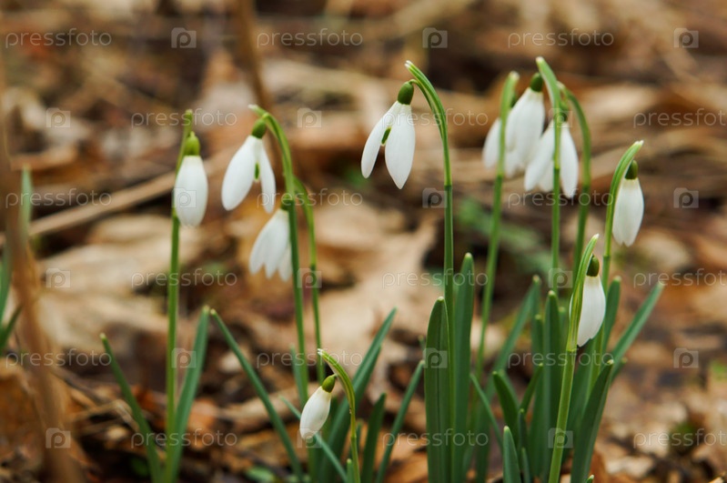 Подснежники в сухой траве, цветущие подснежники весной, белые маленькие весенние цветы