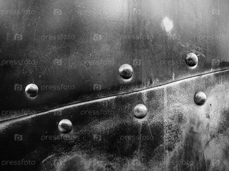 Металлическая поверхность с заклепками и болтами. Абстрактный фон военного или промышленного характера. Обшивка с вмятинами, швами и гайками. Крепежи по металлу. Стальная или бронзовая панель