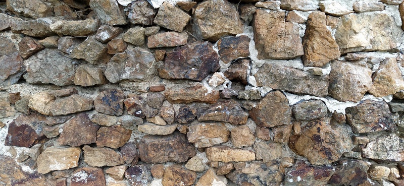 Каменная стена. Сложены большие кирпичи и булыжники в теплых тонах. Свободные белые камни, торчащие из поверхности стены
