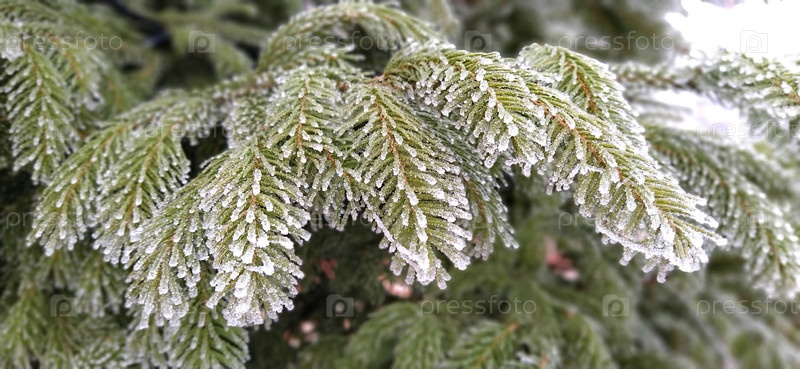 Красивые ветки ели в инее. Замерзшая ледяная хвоя хвойных деревьев. Иголки в снегу. Открытка с Новым годом или Рождеством