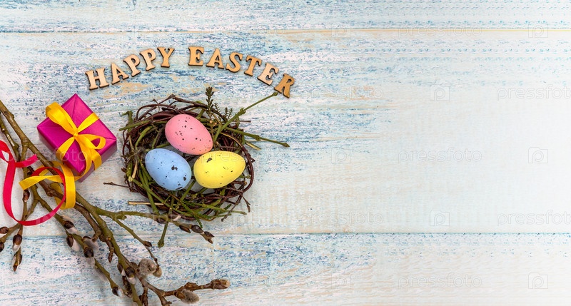 Подарочные коробки с лентами. Христос воскрес. Веточки ивы. Святая Пасха. Синий бирюзовый фон. Пасхальные яйца в гнезде