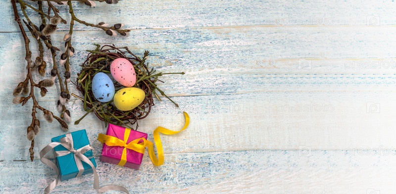 Подарочные коробки с лентами. Христос воскрес. Веточки ивы. Святая Пасха. Синий бирюзовый фон. Пасхальные яйца в гнезде