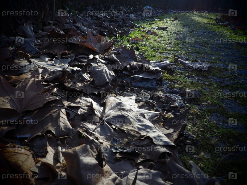 Осенняя тропа в городском парке. Сухие кленовые листья и низкие солнечные лучи. Красивый пейзаж. Поздняя осень или бесснежная зима. Брусчатка с мхом и лишайниками на дороге. Английский парк