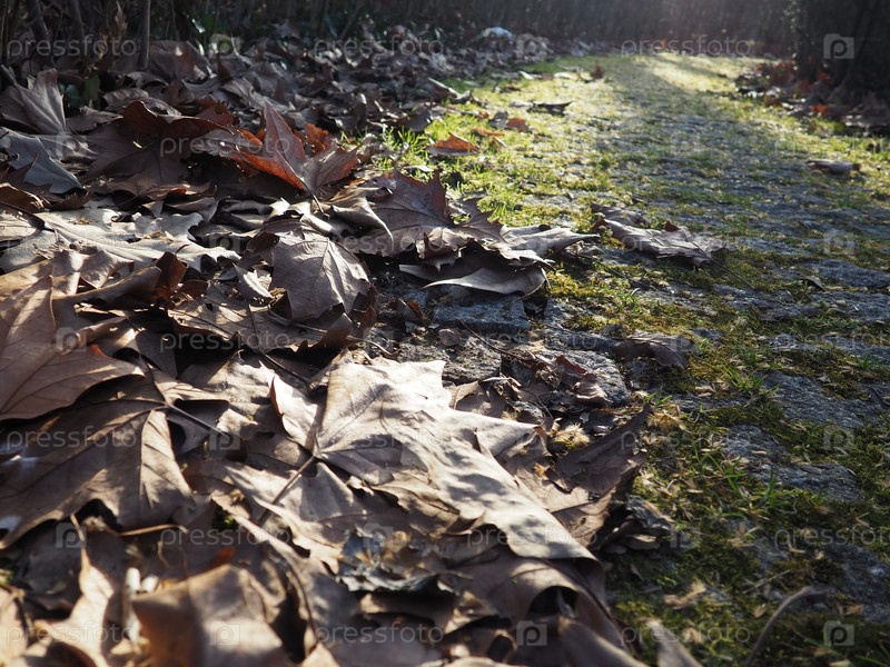 Сухие кленовые листья на мощеной парковой дороге. Мох на камнях. Низкий солнечный луч. Осень или бесснежная зима. Меланхоличный пейзаж с перспективой вдаль