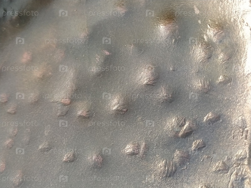 Медный текстурный фон. Бронзовая текстура. Неровная металлическая поверхность с круглыми вмятинами. Размытие по краям изображения. Естественное освещение