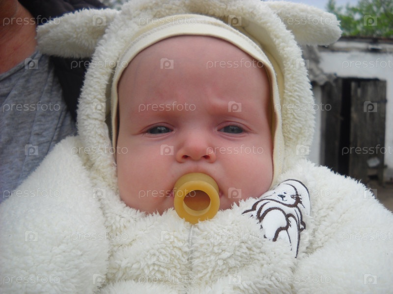 Ребенок сосет странную резиновую соску. Необычная, старинная форма детской пустышки. Малыш одет в белый пушистый комбинезон с ушками, как у зайца. Серьезный взгляд вперед. У девушки толстые щеки