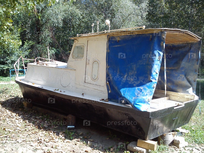 На берегу стоит старый ржавый корабль. Хорошая погода. Синий полиэтилен покрывает заднюю часть лодки