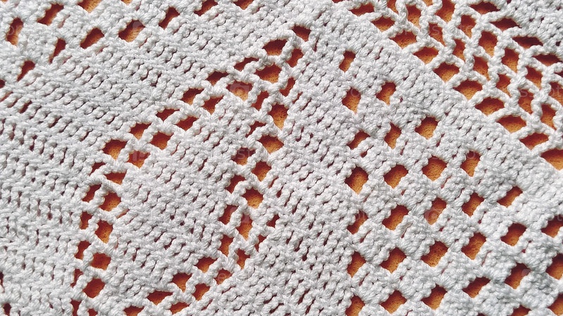Белое кружево связано вручную крючком. Салфетка с квадратными и ромбовидными отверстиями. Орнамент в традиционном деревенском стиле. Аккуратная работа крючком или спицами. Хлопковые белые нитки. Оранжевый фон