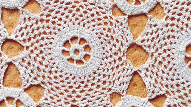 Белое кружево связано вручную крючком. Круглая салфетка на стол или комод. Орнамент в традиционном деревенском стиле. Аккуратная работа крючком или спицами. Хлопковые белые нитки. Оранжевый фон