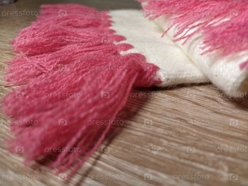 Шарф выполнен из белых и розово-белых ниток. Вязание на деревянном столе. Пустое место для текста. Мягкие пастельные тона. Зимняя одежда