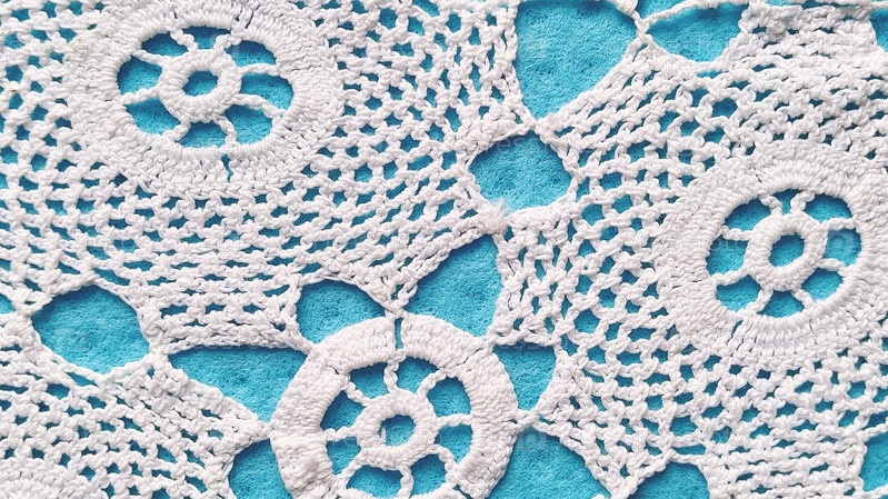 Белое кружево связано вручную крючком. Круглая салфетка на стол или комод. Орнамент в традиционном деревенском стиле. Аккуратная работа крючком или спицами. Хлопковые белые нитки. Синий фон