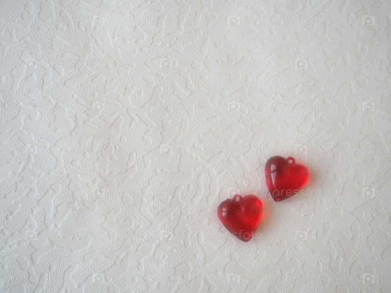 Валентинские сердечки. Красные пластиковые прозрачные сердечки. Поздравительная открытка с белым фоном к празднику Дня святого Валентина. Выражение любви. Копирование пространства. Плоская планировка. Белый волнистый фон