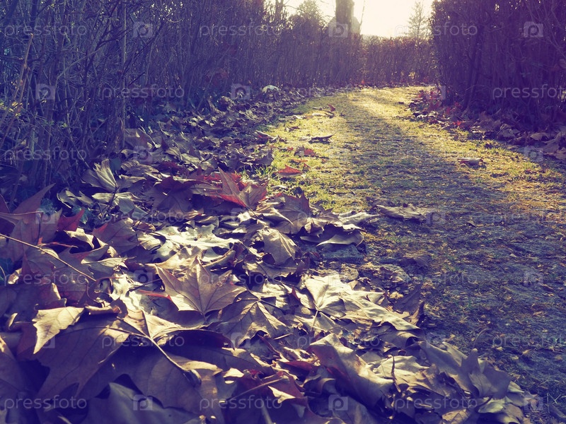 Сухие кленовые листья на мощеной парковой дороге. Мох на камнях. Низкий солнечный луч. Осень или бесснежная зима. Меланхоличный пейзаж с перспективой вдаль