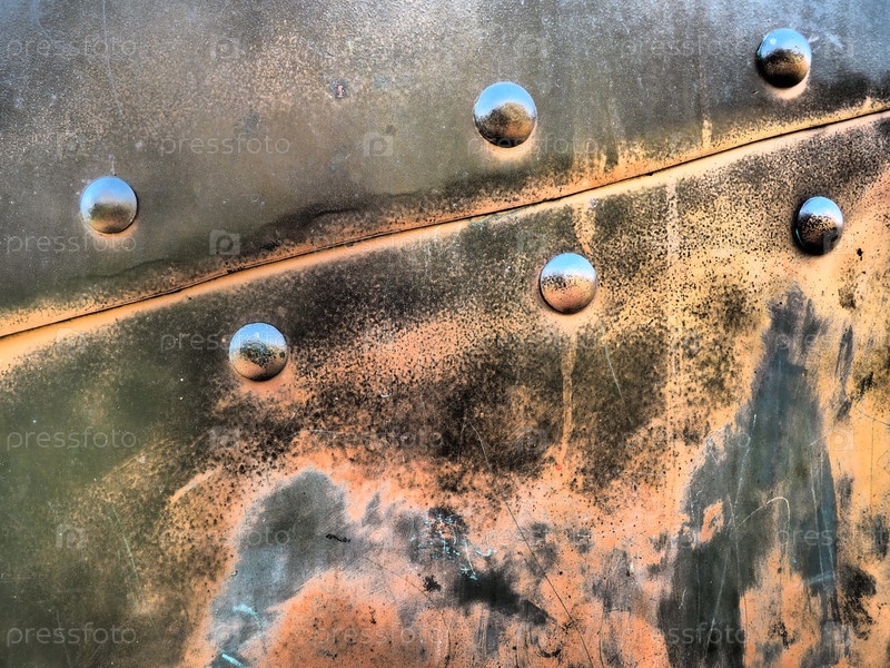 Металлическая поверхность с заклепками и болтами. Абстрактный фон военного или промышленного характера. Обшивка с вмятинами, швами и гайками. Крепежи по металлу. Стальная или бронзовая панель