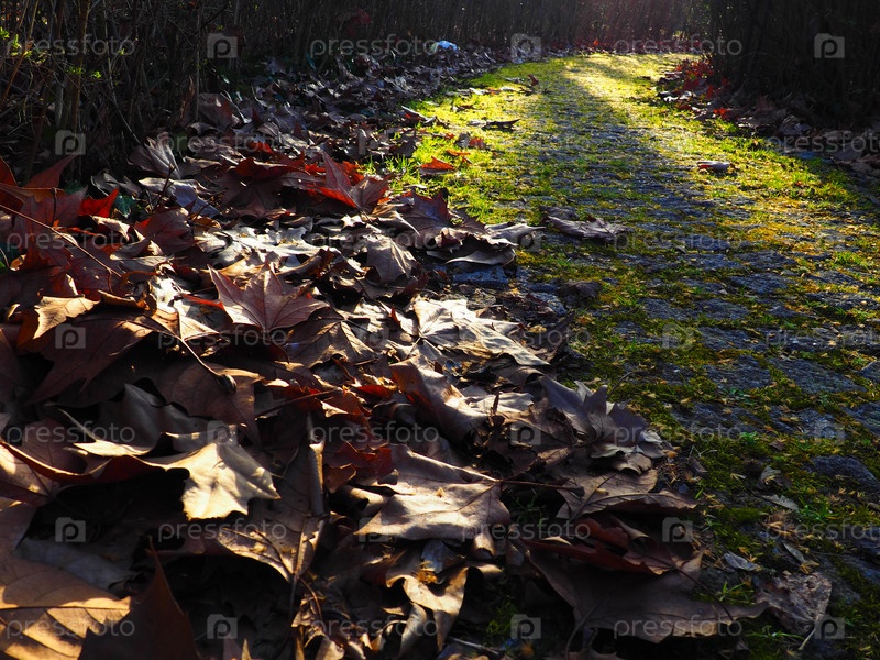 Осенняя тропа в городском парке. Сухие кленовые листья и низкие солнечные лучи. Красивый пейзаж. Поздняя осень или бесснежная зима. Брусчатка с мхом и лишайниками на дороге. Английский парк