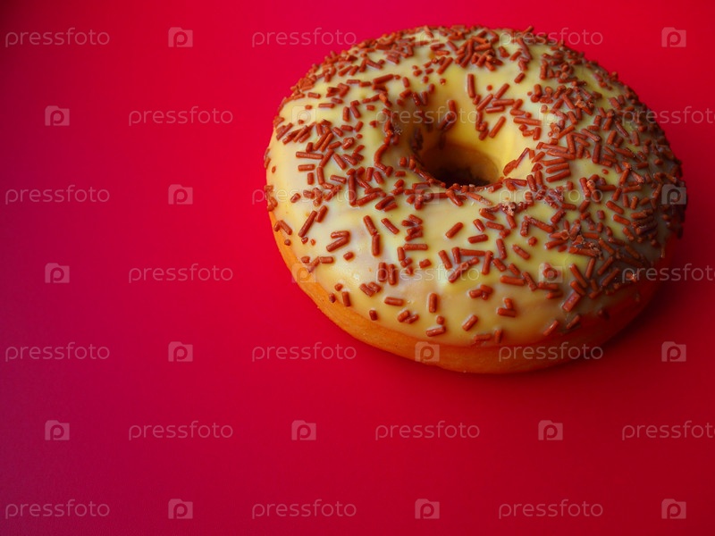 Пончик или пончик. Разновидность дрожжевого жареного теста. Сладкая закуска, которую можно приготовить дома или купить в пекарнях, супермаркетах, продуктовых ларьках. Вкусный пирог с легкой глазурью на красном фоне