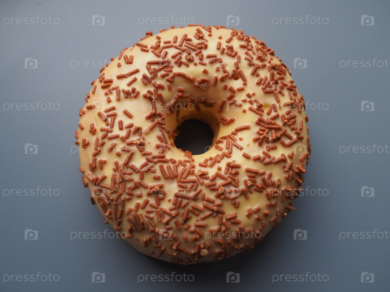 Пончик или пончик. Разновидность дрожжевого жареного теста. Сладкая закуска, которую можно приготовить дома или купить в пекарнях, супермаркетах, продуктовых ларьках. Вкусный пирог с легкой глазурью на сером фоне