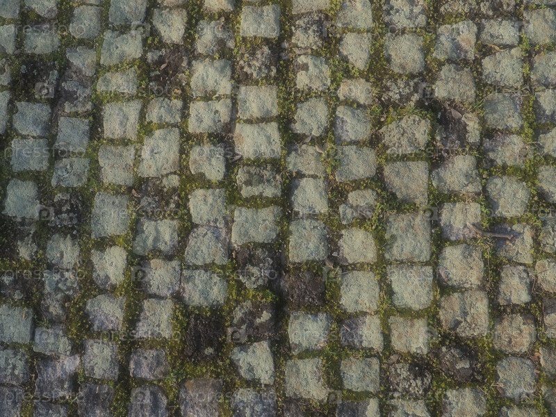 Аккуратно выложенная старая брусчатка. Тротуар на площади старого города. Квадратные и прямоугольные камни на земле, покрытые мхом и лишайниками