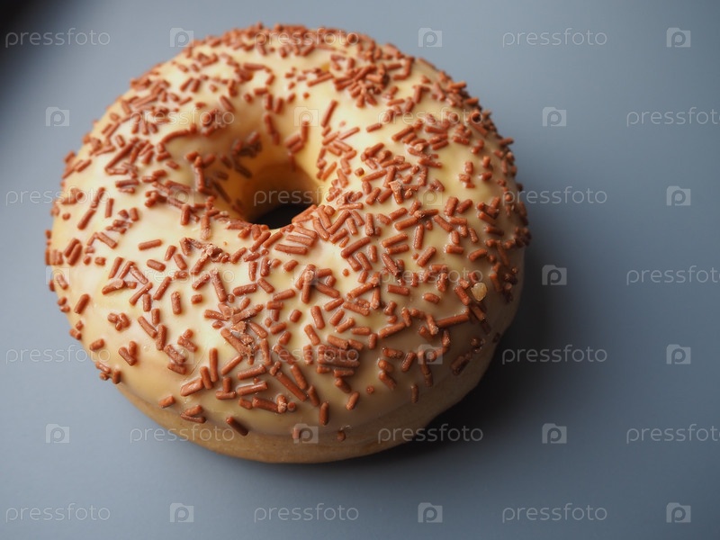 Пончик или пончик. Разновидность дрожжевого жареного теста. Сладкая закуска, которую можно приготовить дома или купить в пекарнях, супермаркетах, продуктовых ларьках. Вкусный пирог с легкой глазурью на сером фоне