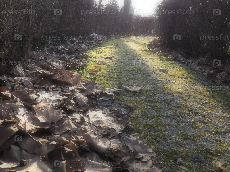 Осенняя тропа в городском парке. Сухие кленовые листья и низкие солнечные лучи. Красивый пейзаж. Поздняя осень или бесснежная зима. Брусчатка с мхом и лишайниками на дороге. Английский парк