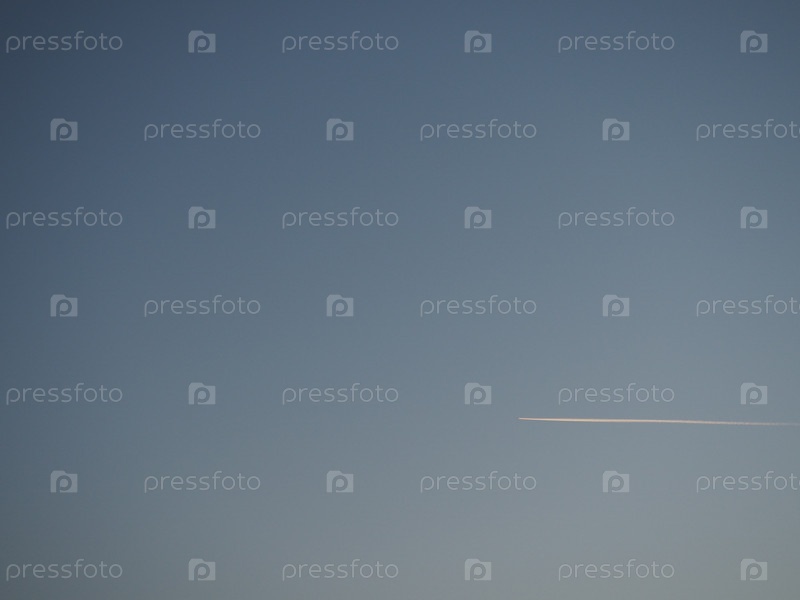 Самолет и след в вечернем небе голубом. Абстрактный фон на космическую или авиационную тему. Цветовой градиент
