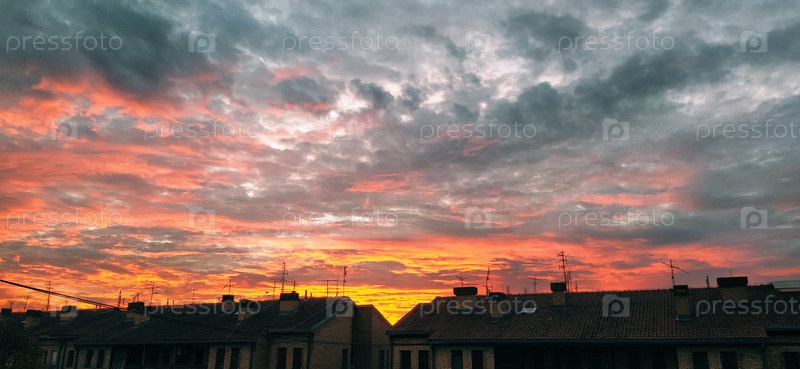 Драматические красивые облака во время заката. Кучевые облака подсвечены оранжевым и розовым цветом. Темные и серые тона. Баннер. Нежные пастельные тона. Облака над крышами города