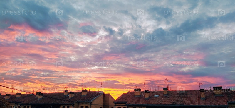 Драматические красивые облака во время заката. Кучевые облака подсвечены оранжевым и розовым цветом. Темные и серые тона. Баннер. Нежные пастельные тона. Облака над крышами города