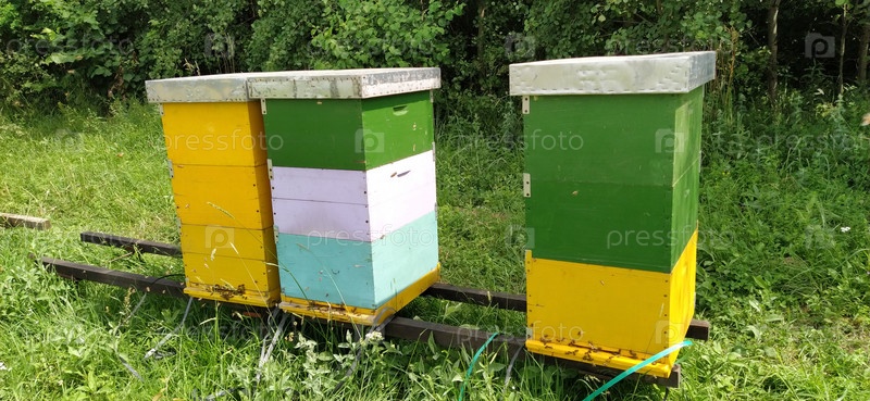 Ульи с пчелами. Пчеловодство. Ульи, стоящие в природе, окрашены в желтый, зеленый и синий цвета. Растения – медоносы. Пасека в Сербии. Пчелы собирают цветочный нектар и превращают его в мед
