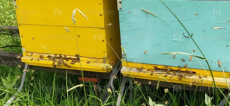 Ульи с пчелами. Пчеловодство. Ульи, стоящие в природе, окрашены в желтый, зеленый и синий цвета. Растения – медоносы. Пасека в Сербии. Пчелы собирают цветочный нектар и превращают его в мед