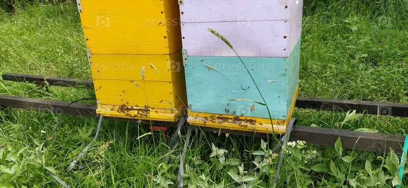 Ульи с пчелами. Пчеловодство. Ульи, стоящие в природе, окрашены в желтый, зеленый и синий цвета. Растения – медоносы. Пасека в Сербии. Пчелы собирают цветочный нектар и превращают его в мед