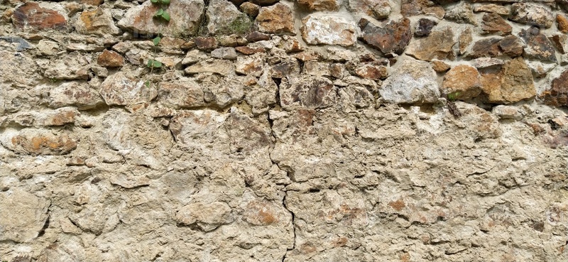 Каменная стена. Сложены большие кирпичи и булыжники в теплых тонах. Свободные белые камни, торчащие из поверхности стены