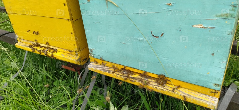 Ульи с пчелами. Пчеловодство. Ульи, стоящие в природе, окрашены в желтый, зеленый и синий цвета. Растения – медоносы. Пасека в Сербии. Пчелы собирают цветочный нектар и превращают его в мед