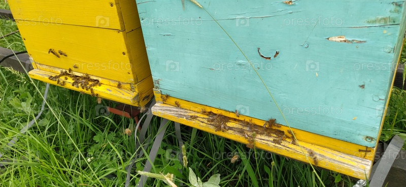 Ульи с пчелами. Пчеловодство. Ульи, стоящие в природе, окрашены в желтый, зеленый и синий цвета. Растения – медоносы. Пасека в Сербии. Пчелы собирают цветочный нектар и превращают его в мед
