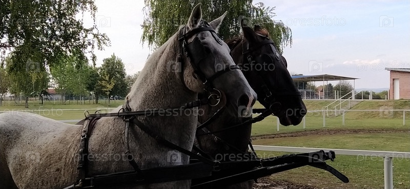 Две лошади с уздечками. Сани с лошадьми. Бело-черная лошадь. Спортивные гонки или катание людей в карете