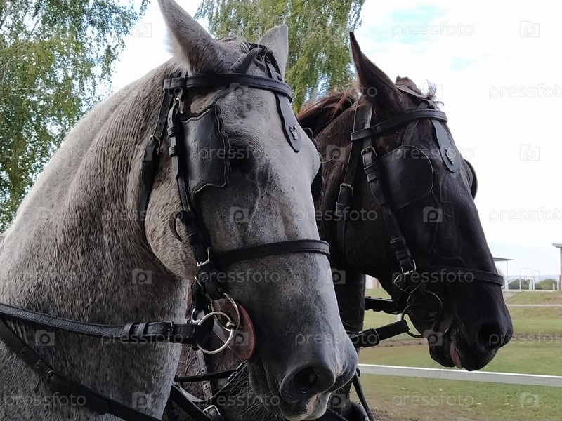 Две лошади с уздечками. Сани с лошадьми. Бело-черная лошадь. Спортивные гонки или катание людей в карете