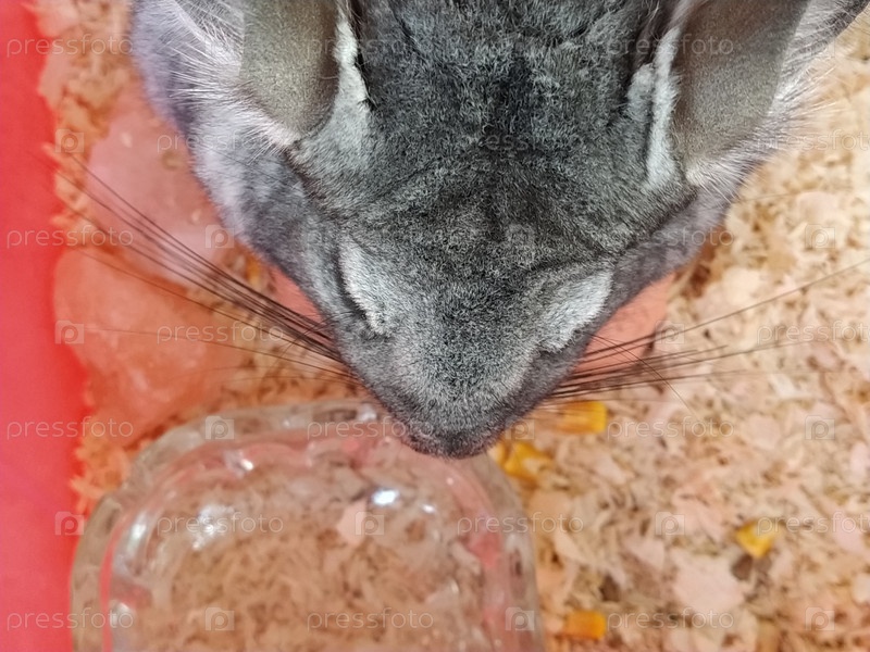 Маленькая милая шиншилла ест еду в клетке. У зверька серый мех и черные выпученные глаза. Фото сверху, крупным планом. Держать животных. Уход за шиншиллой в неволе