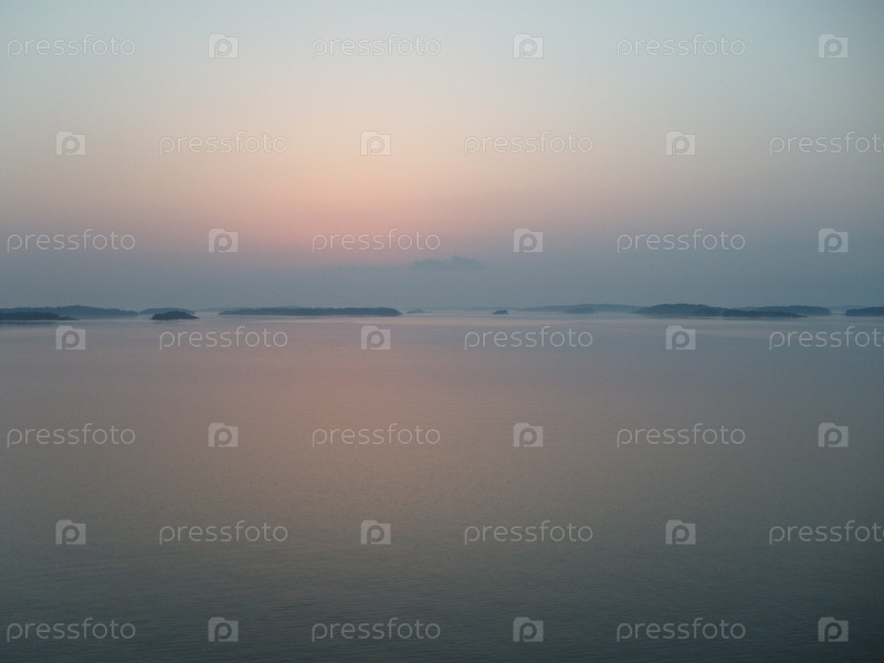 Белые ночи на Балтийском море. Финские шхеры в тумане и ночной дымке. Красивый пейзаж в серо-коричневых тонах. Розовые и голубые цвета неба и воды. Горизонт. Отражение неба в воде