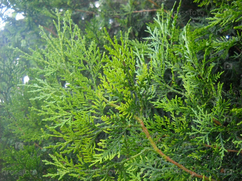 Молодые светло-зеленые побеги туи. Туя широко используется для озеленения городов, для ландшафтного дизайна. Неприхотливое и морозостойкое растение