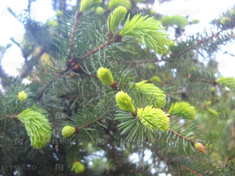 На ветках ели появилась молодая светло-зеленая хвоя. На старых ветвях образуются новые весенние побеги. Хорошо видны светло-зеленые ростки