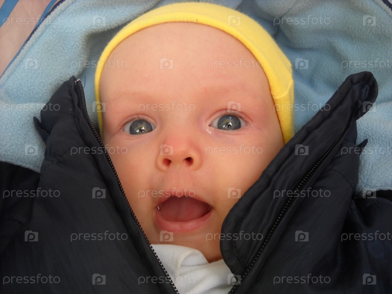 Малыш лежит в коляске и от удивления открывает рот. Ребенок одет в легкую шапочку и теплый комбинезон. Из левого глаза течет слеза