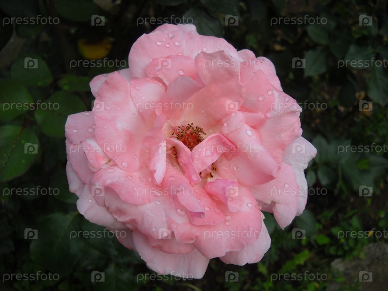 Розовая роза в саду. Раскрытые лепестки с каплями воды. Заметны пестики и тычинки. Цвет с теплым оттенком. Сфотографировано сверху