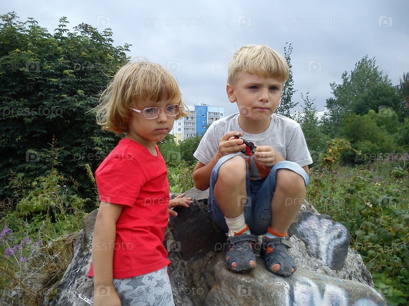 Мальчик и девочка – брат и сестра. Дети со светлыми волосами гуляют рядом с деревьями и кустами. Девушка в очках и красной футболке. Ребята забрались на большой камень – булыжник. Задумчивое выражение лица