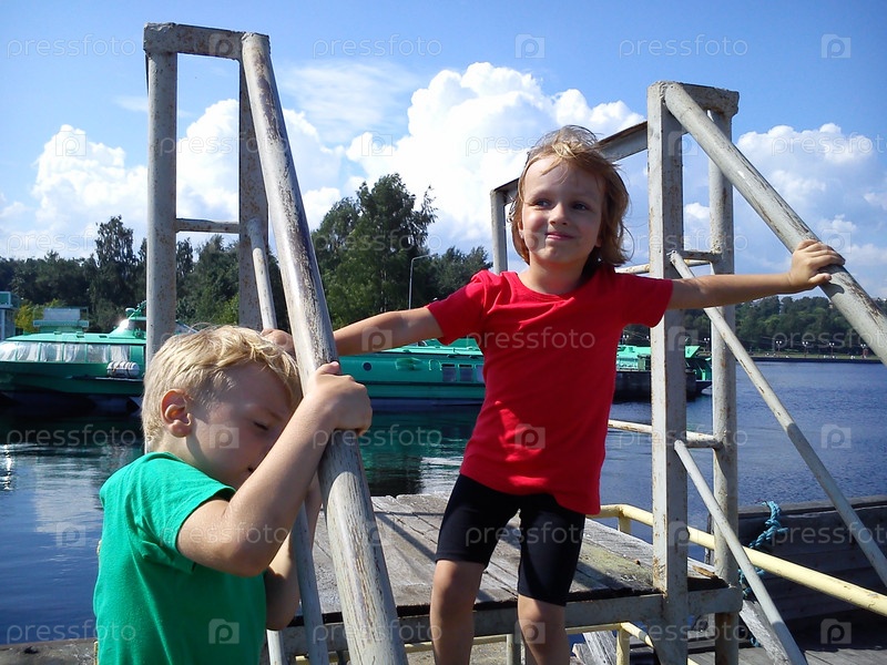 Мальчик и девочка позируют на пирсе. Красные и зеленые футболки без рисунков. Дети играют возле металлических конструкций в порту. Корабли и плавсредства на заднем плане. Северное лето. Путешествие начинается